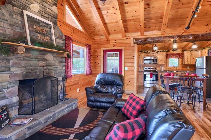 This beautiful 1 bedroom/ 4 person cabin is very secluded and is a perfect cabin for a couples getaway or a family vacation! Sunset Cove features a fully equipped kitchen/dining area, a living room with a wood burning fireplace, bathroom with a tub/shower, and a bedroom with a beautiful queen size log bed! There is a futon located in the living area as well. Enjoy the beautiful view from the deck as you relax in the hot tub, sit on the porch swing, or cook on the gas grill! Venture off the deck to the firepit where you can roast marshmallows and gaze at the stars!!